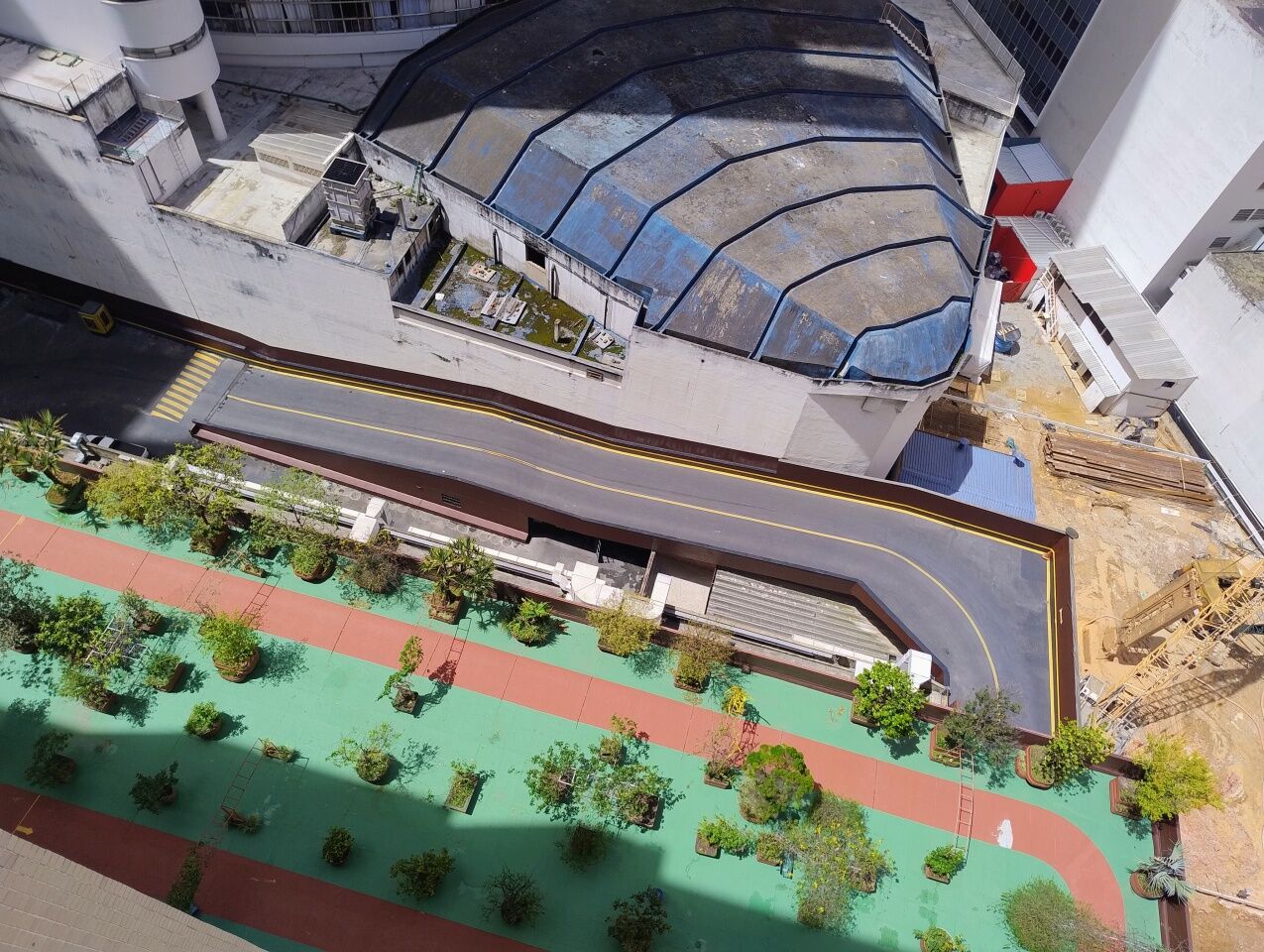Pista de Cooper diferenciada com amplos jardins e plantas no entorno.
