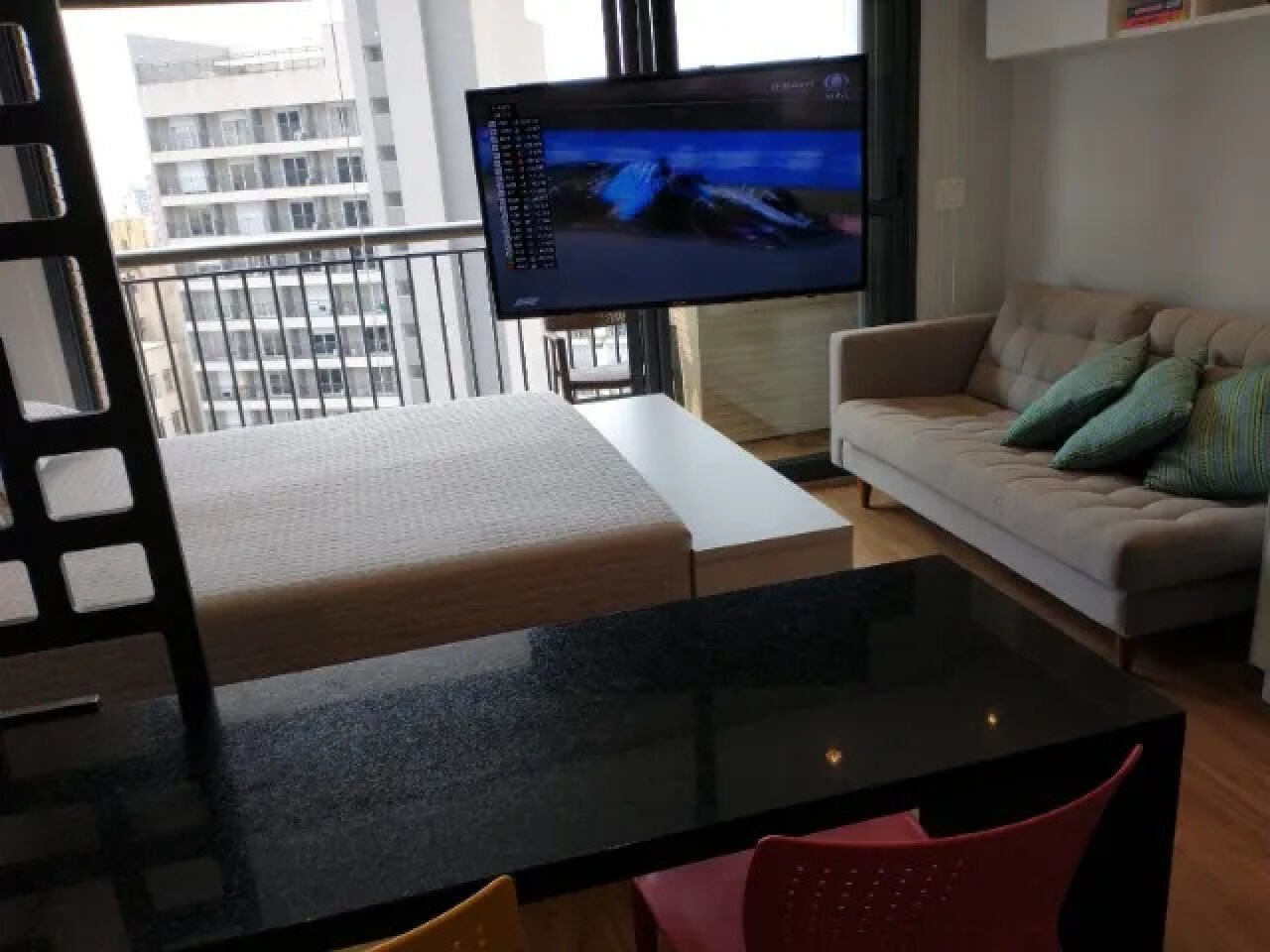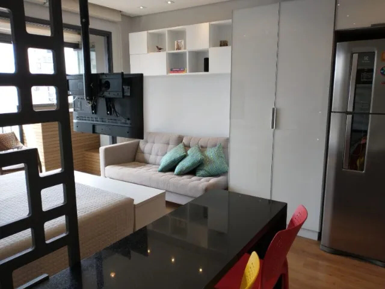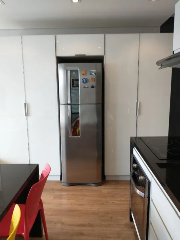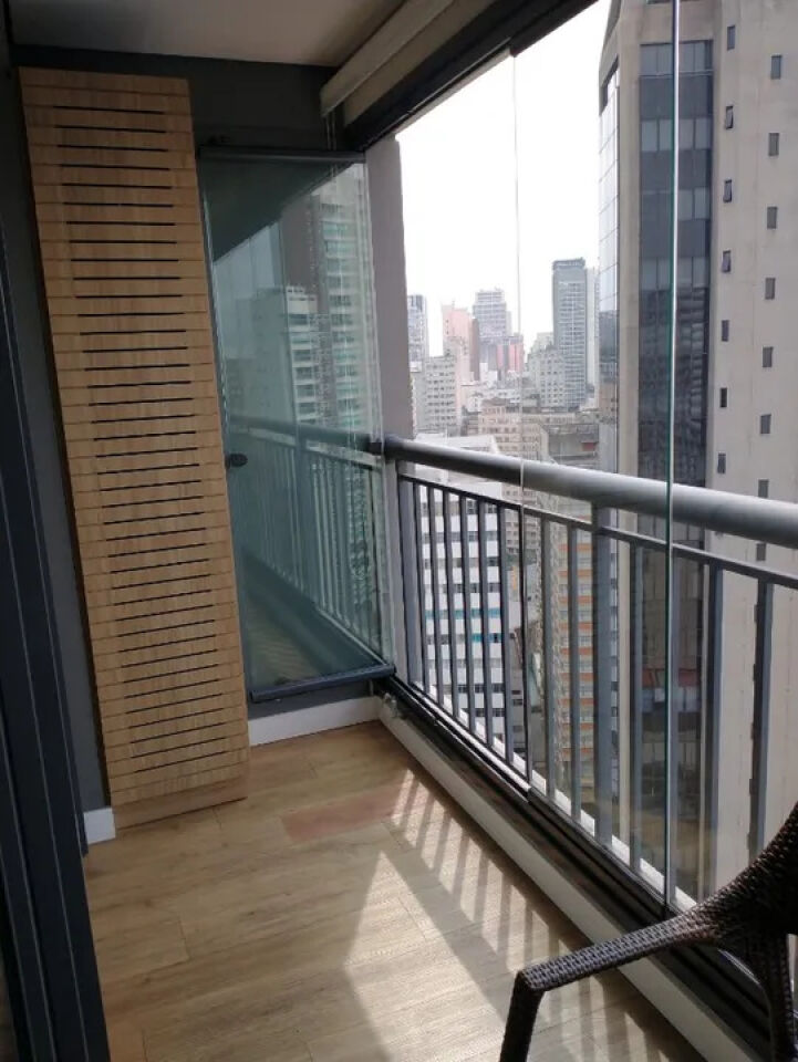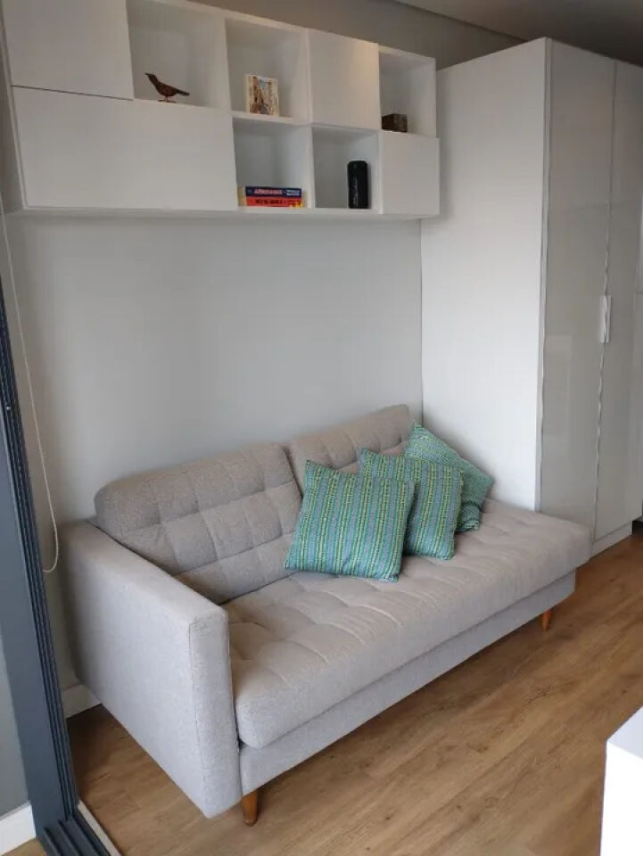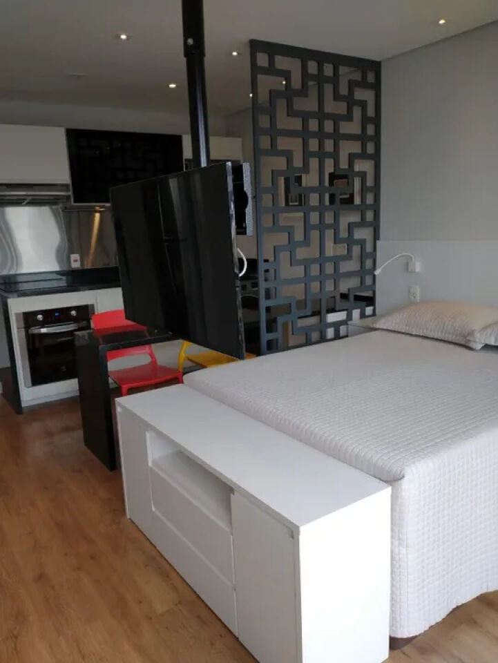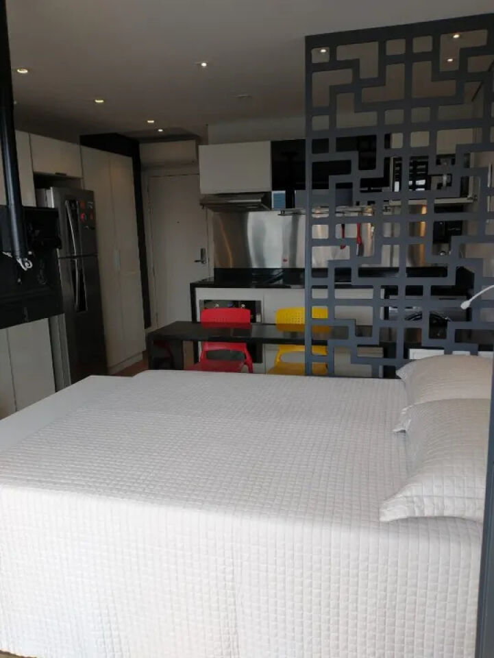 Aconchegante studio com todos os ambientes integrados e planejados por arquiteta, mobiliado e equipado, com ar-condicionado inverter, smart TV com giro de 360 graus, geladeira frost free, cooktop de 4 bocas, depurador, forno elétrico, microondas, filtro de água de parede, máquina lava e seca, bancadas em granito, metais Deca/Docol, louças Deca, armários planejados, cama box com baú, iluminação em led para cada ambiente, sofá, cortinas blackout e corta-luz, sacada fechada com vidros temperados. Aquecimento central para o banho e torneiras. Piso vinílico no apartamento e porcelanato no banheiro. Fechadura biométrica e por senha.