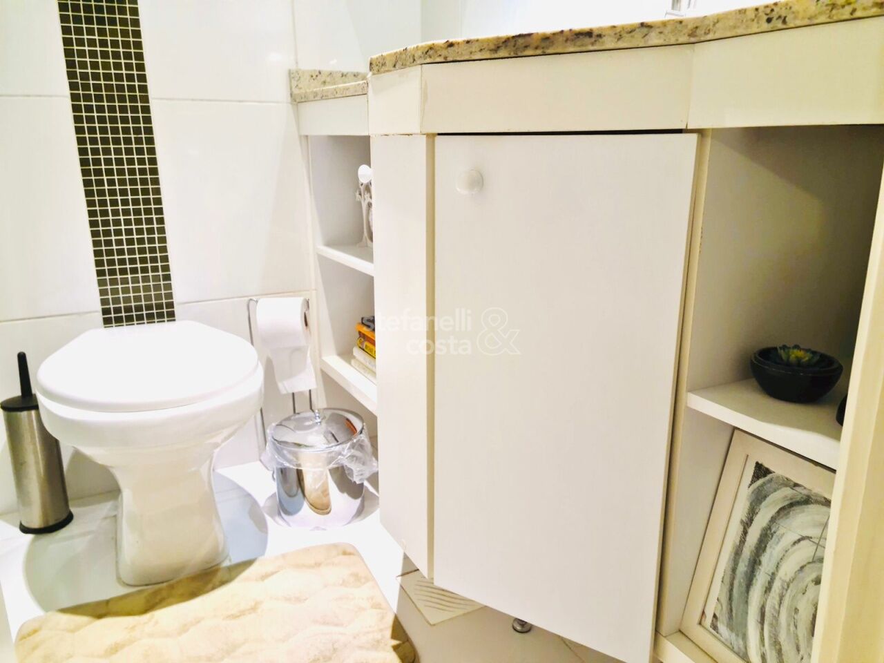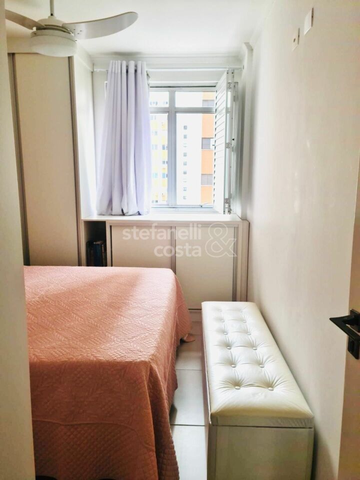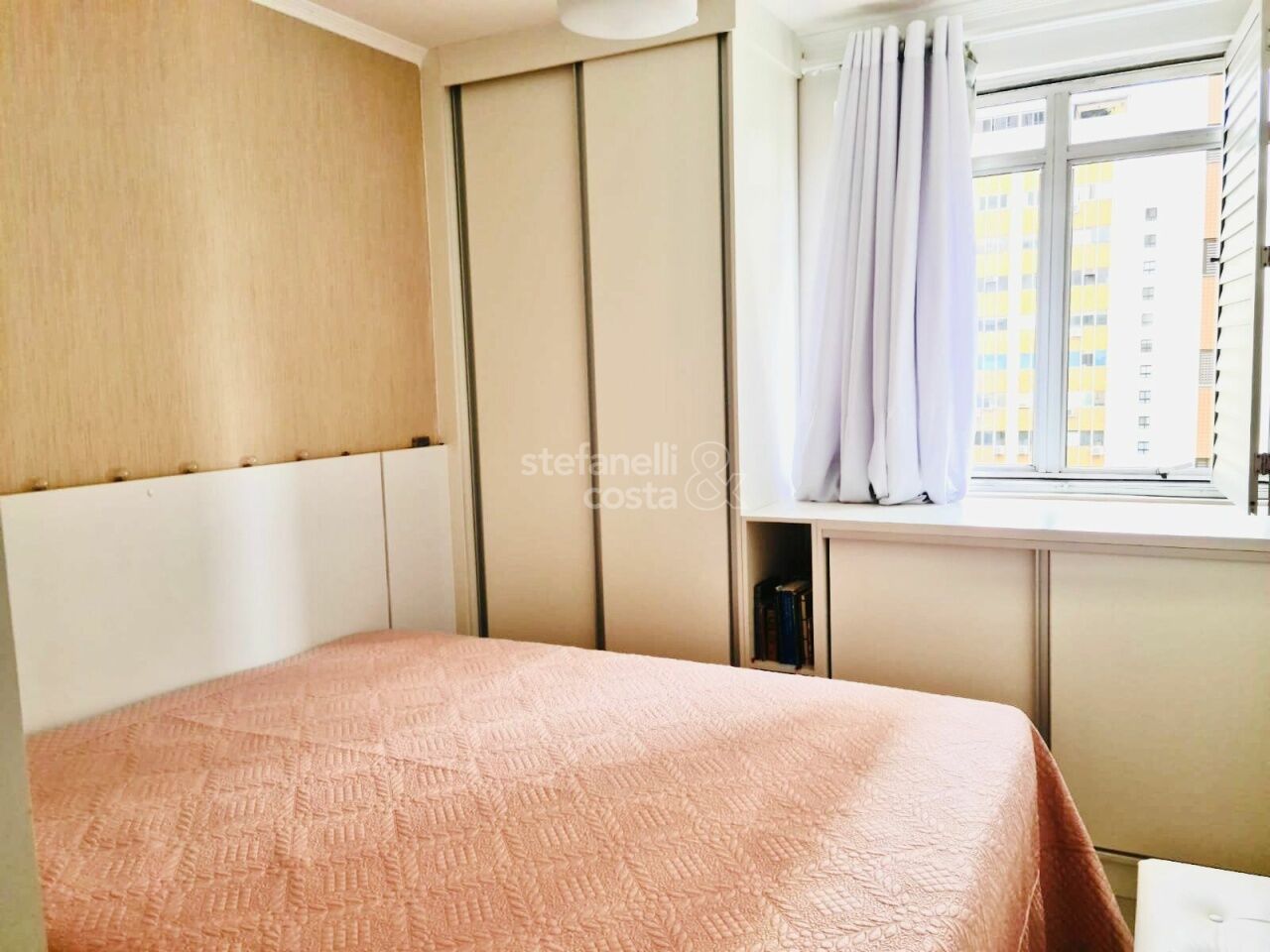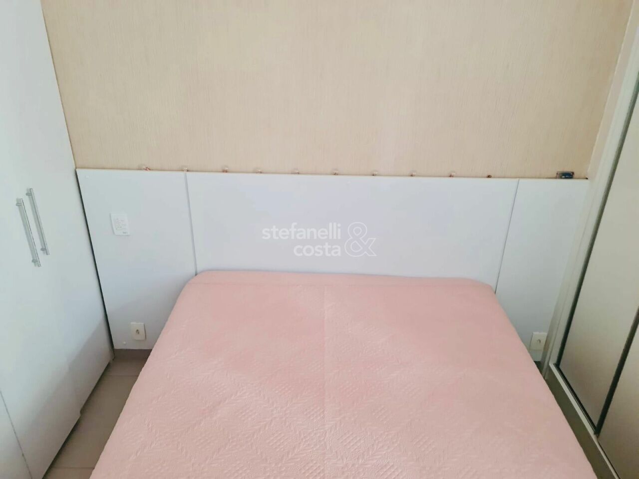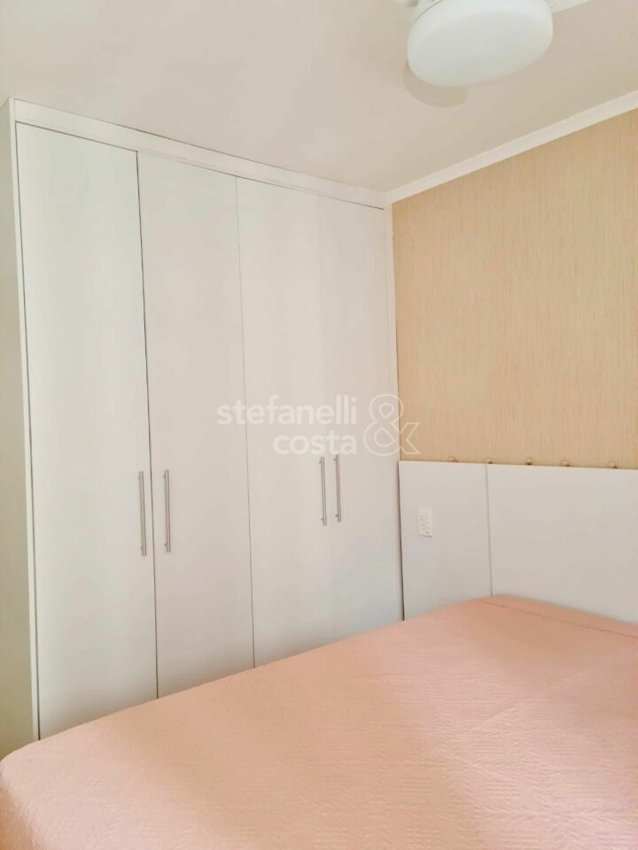 Armários embutidos no quarto, banheiro e cozinha.