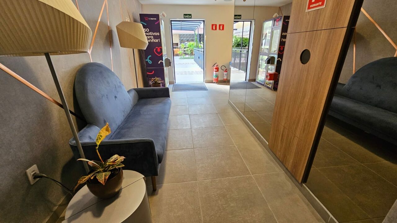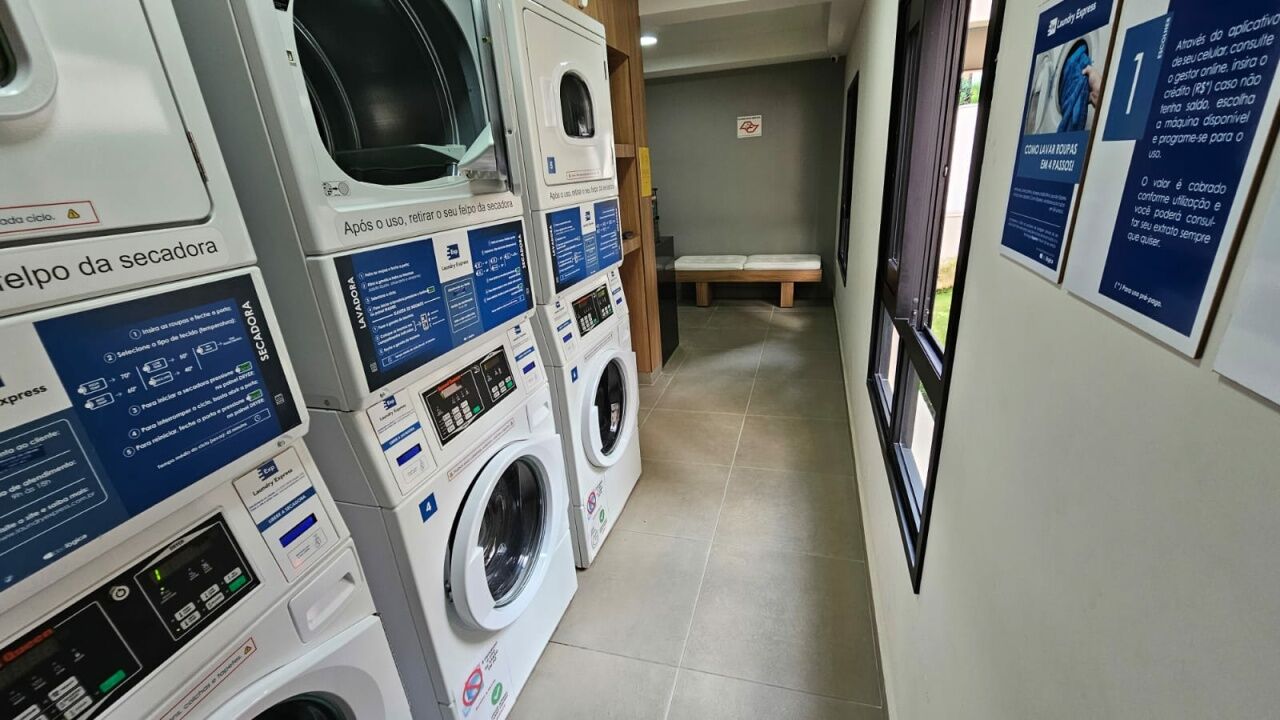 Fechadura digital, portaria 24 horas, academia, lavanderia, academia, churrasqueira e salão de festas.
