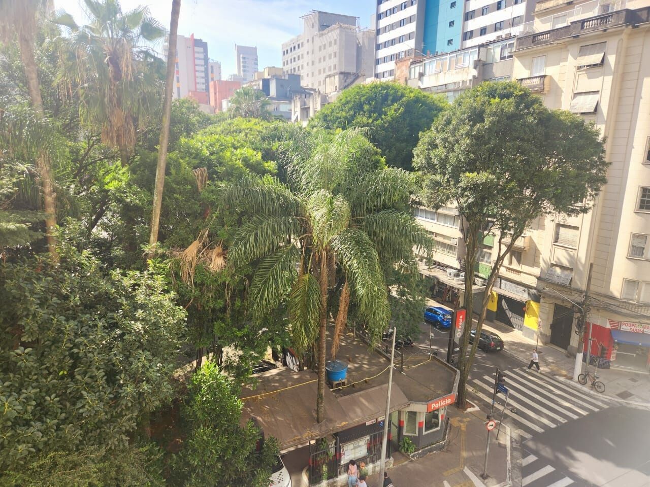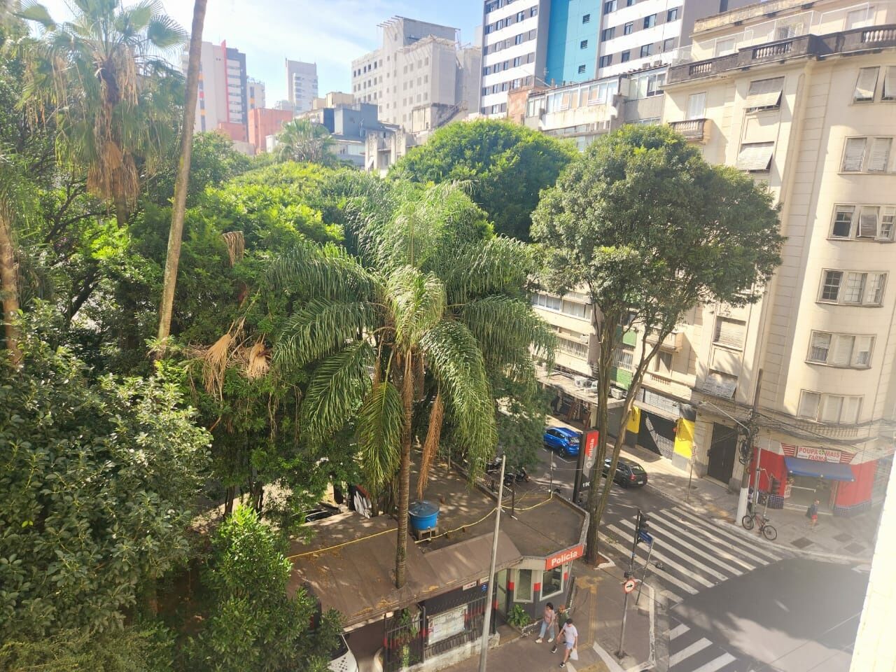 ? Em frente a uma maravilhosa praça com posto policial